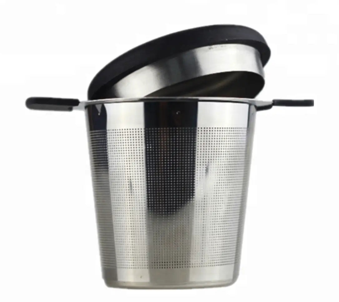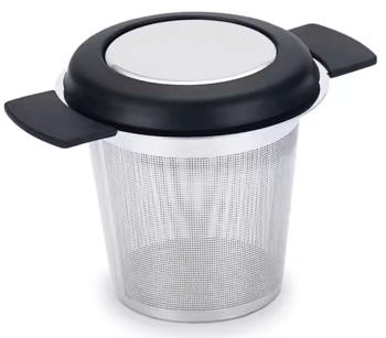 Loose leaf tea infuser strainer with lid. Made of stainless steel mesh with lid and black silicone double handles.
