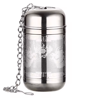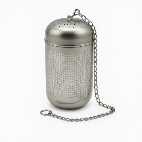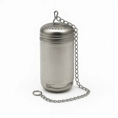 Cylinder style tea strainer / infuses made of stainless steel with fine mesh.